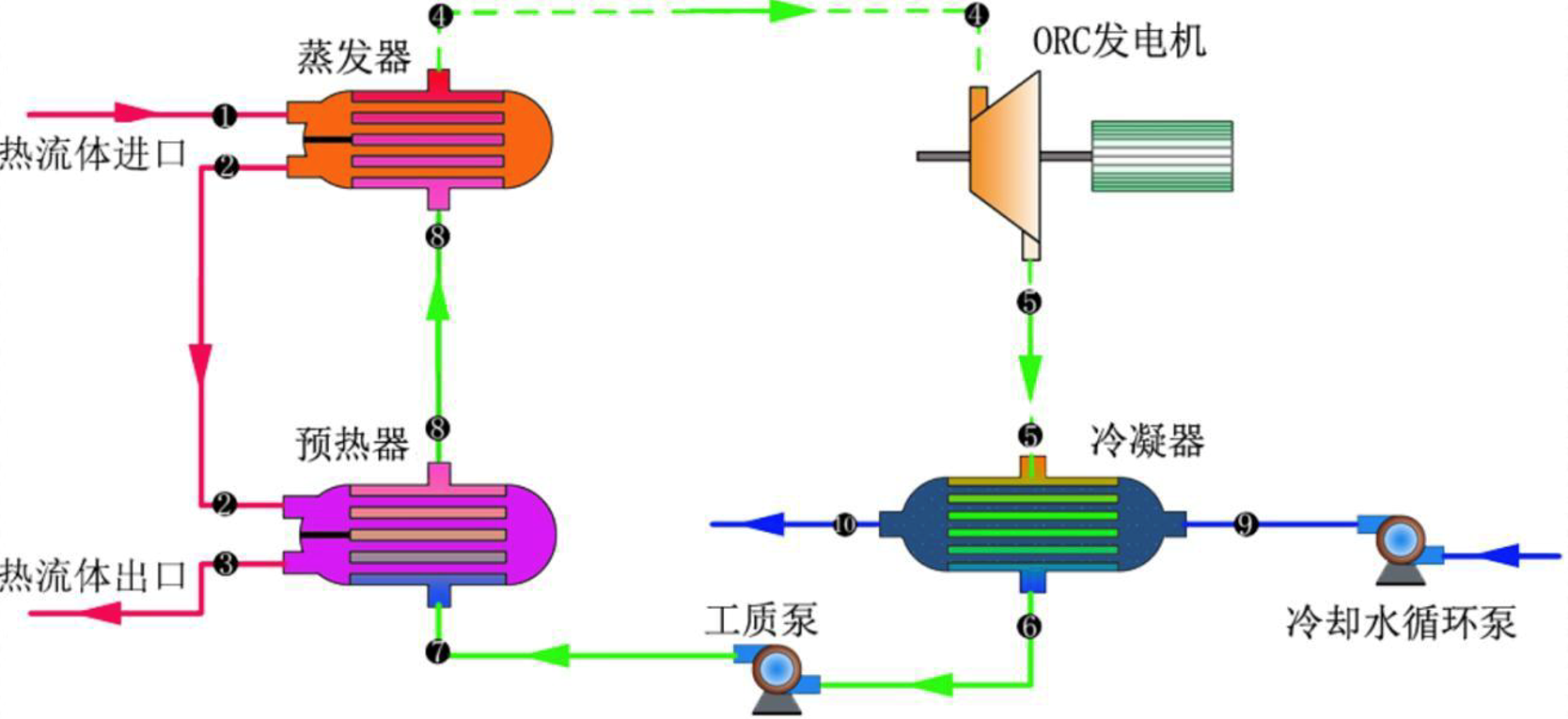 ▫ 循环流程:蒸发器(余热换热)→膨胀机(发电)→冷凝器(冷却)→工质泵(循环)。